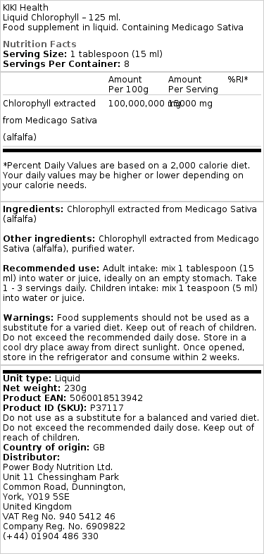 Pentru o integrare eficientă în rutina zilnică,recomandăm administrarea unei linguri (15 ml) diluat în apă sau suc,preferabil pe stomacul gol,una pânâ la trei ori pe zi. Clorofila lichidã KIKI Health vine într-un recipient convenabil de 125 ml, ușor de depozitat și utilizat.