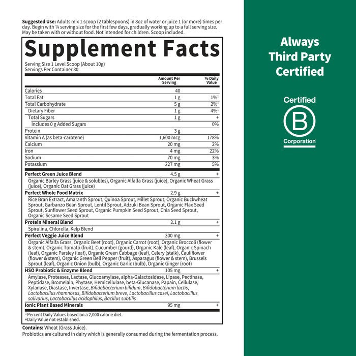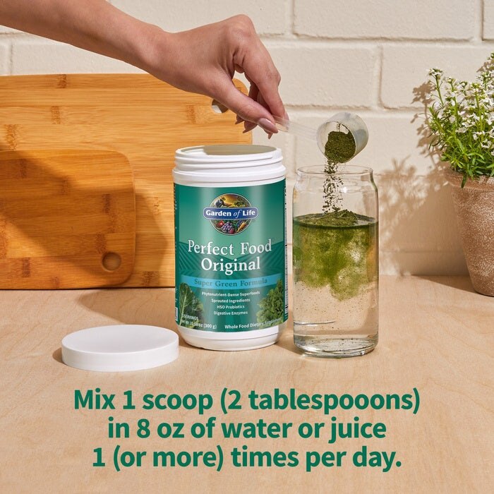Pentru rezultate optime se recomandã integrarea acestui supliment într-un regim echilibrat și variat, alaturi de practicarea regulată a exercițiilor fizice.La garden of Life ne dedicăm să selectăm cu atenție suplimentele care susțin un stil de viațā echilibrat și sănatos. Alege Perfect Food Original – o solutie naturalã si eficientã pentru binele tãu!