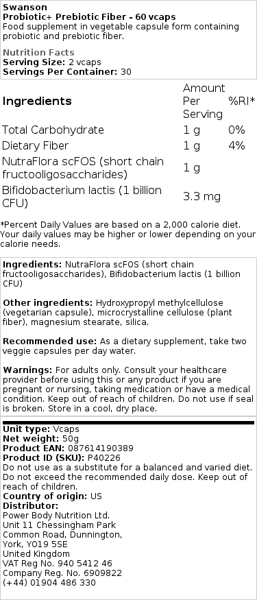Descoperiți Probiotic+ Prebiotic Fiber – 60 vcaps, un supliment alimentar inovator de la Swanson, conceput pentru a susține echilibrul și binele digestiv. Provenind din Statele unite, acest produs combină eficient probioticele cu fibre prebiotice într-o formulă unică, gândită să se integreze armonios în rutina zilnică de sănătate.