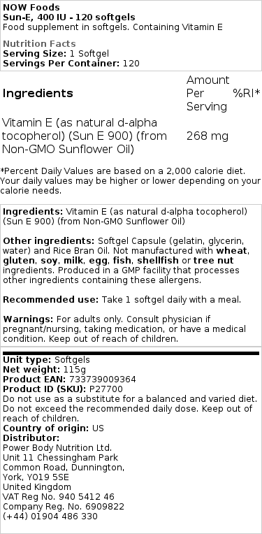 Sun-E, 400 IU este formulat pentru a oferi suport în menținerea unei funcţionari normale a sistemului imunitar și contribuie la reducerea oboselii și extenuării. Acesta este o sursa excelentă de vitamina E sub formă de softgel ușor de inghitit.
