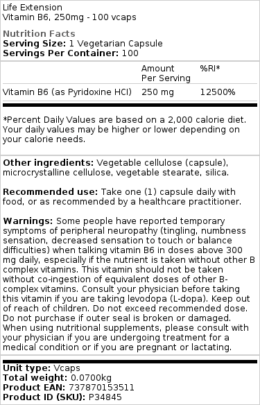 Descoperiți puterea naturală a vitaminei B6 cu suplimentul nostru de înaltă calitate „Vitamin B6, 250mg – 100 vcaps” de la Life Extension. Provenind din Statele Unite, acest produs este conceput pentru a se integra perfect în rutina zilnică de sănătate și wellness.